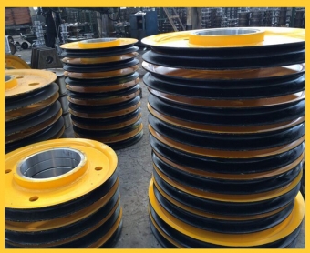 在草莓视频污官网的起升機構中,滑輪起著省力和支撐鋼絲繩並為其導向的作用。對於輕、中型工作類型的橋式草莓视频污官网的滑輪可用灰鑄鐵HT15-33和球墨鑄鐵QT-10製造;對於重級以上工作類型的橋式草莓视频污官网的滑輪,可用鑄鋼ZG25或ZG35製造。對於大直徑(D>800mm)的滑輪可用碳鋼Q235-A焊接。